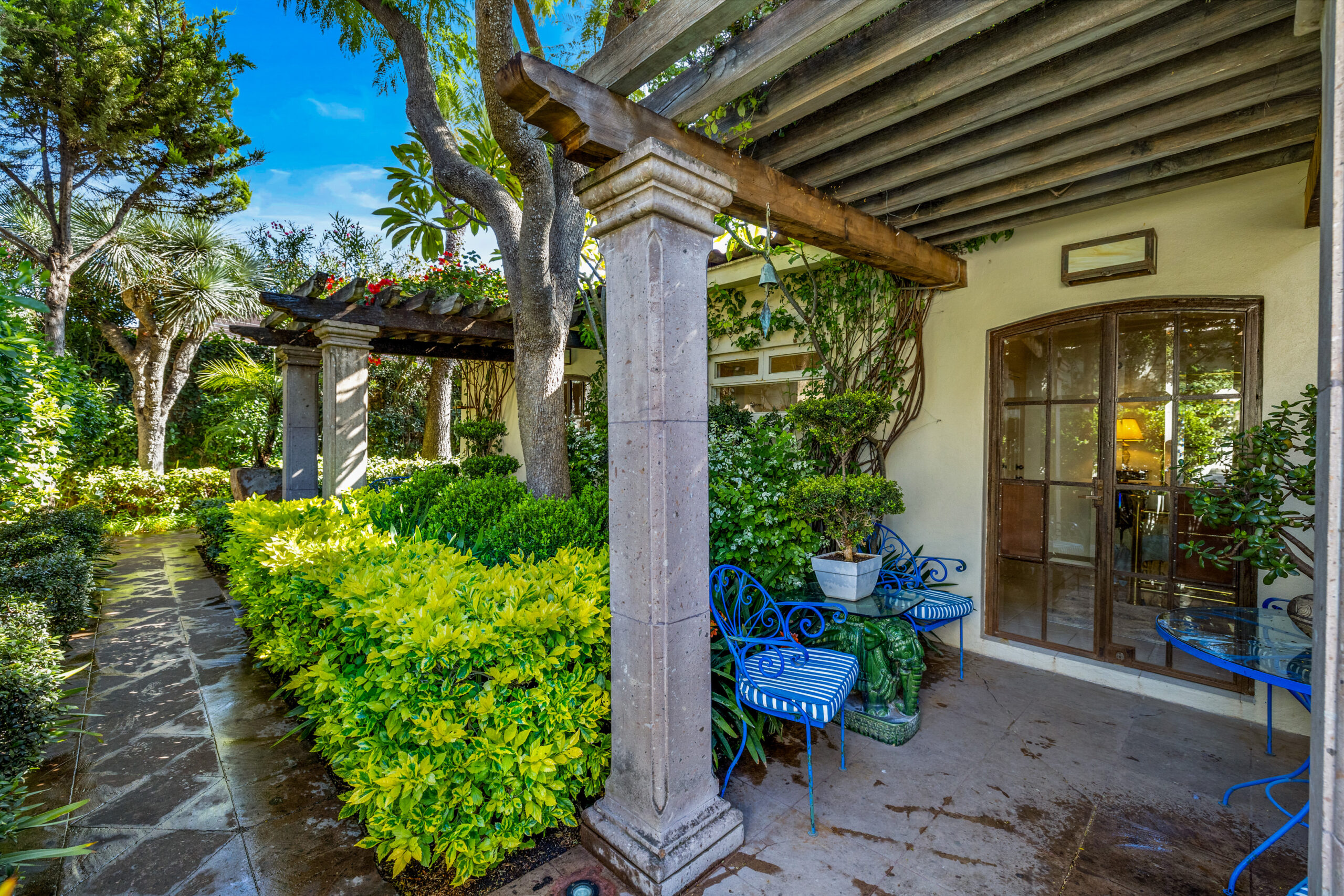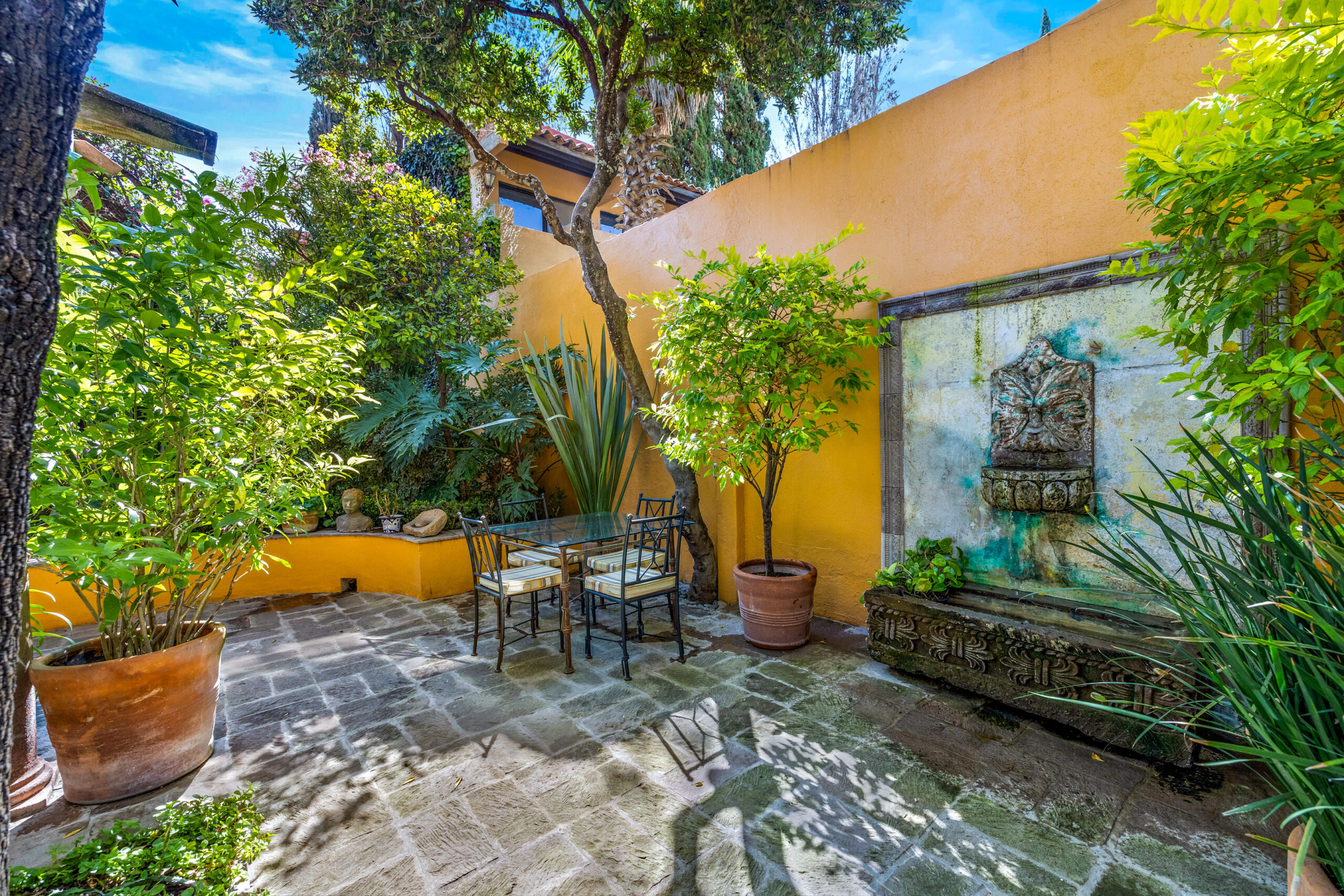 The centerpiece of the property is its spacious covered terrace — a serene spot perfect for hosting friends or relaxing with a good book, all while listening to the tranquil sounds of a large fountain. It’s also a popular venue for local events, having raised funds for several beloved nonprofits, which speaks to the generous spirit the property exudes.