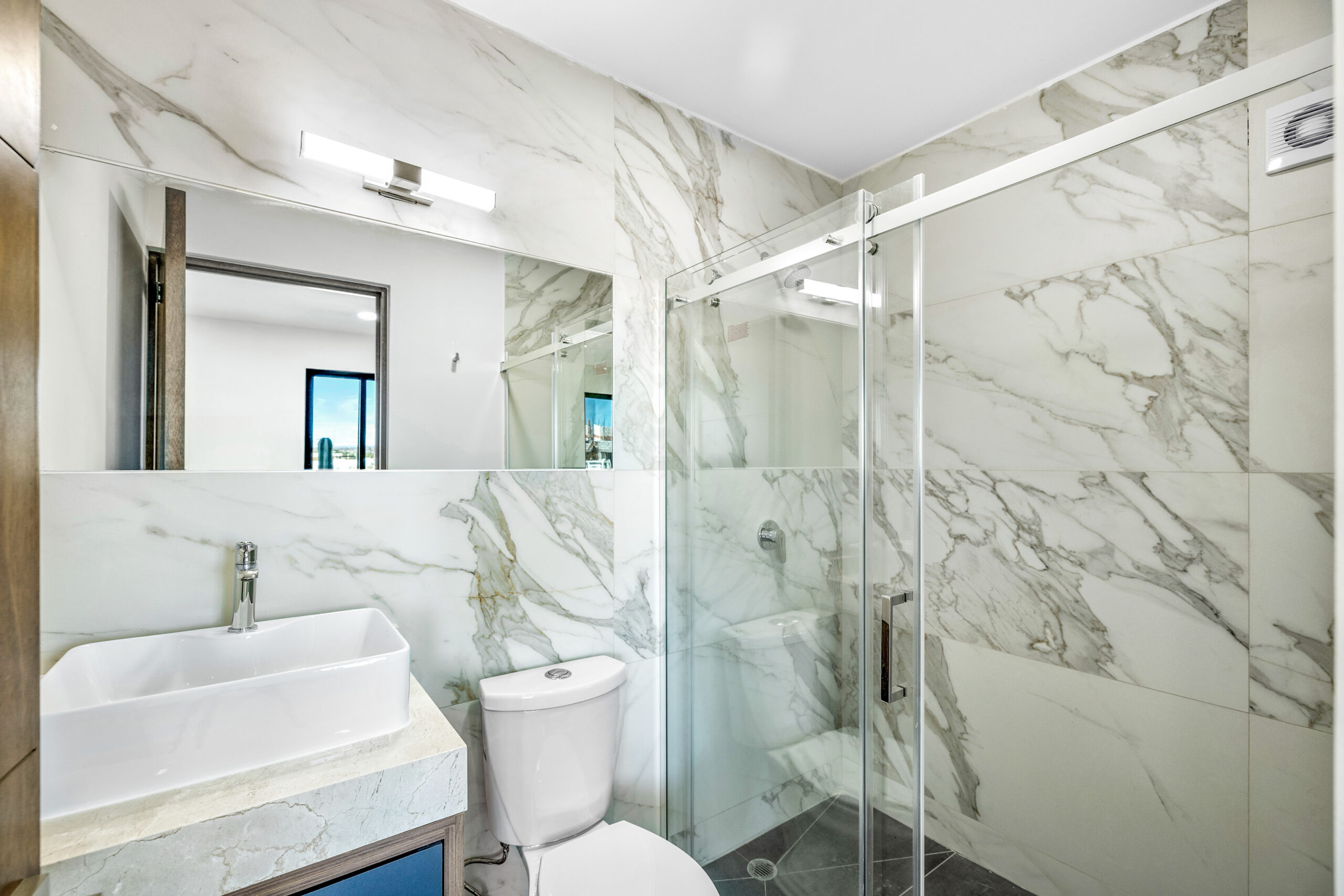The main entrance opens into a large living room that flows seamlessly into the dining area and a spacious, functional kitchen equipped with pantry storage, granite countertops, and a comfortable integrated breakfast bar. Floor-to-ceiling sliding windows connect the interior with the patio, creating a smooth indoor-outdoor transition, filling the space with light and offering the perfect setting for gatherings.