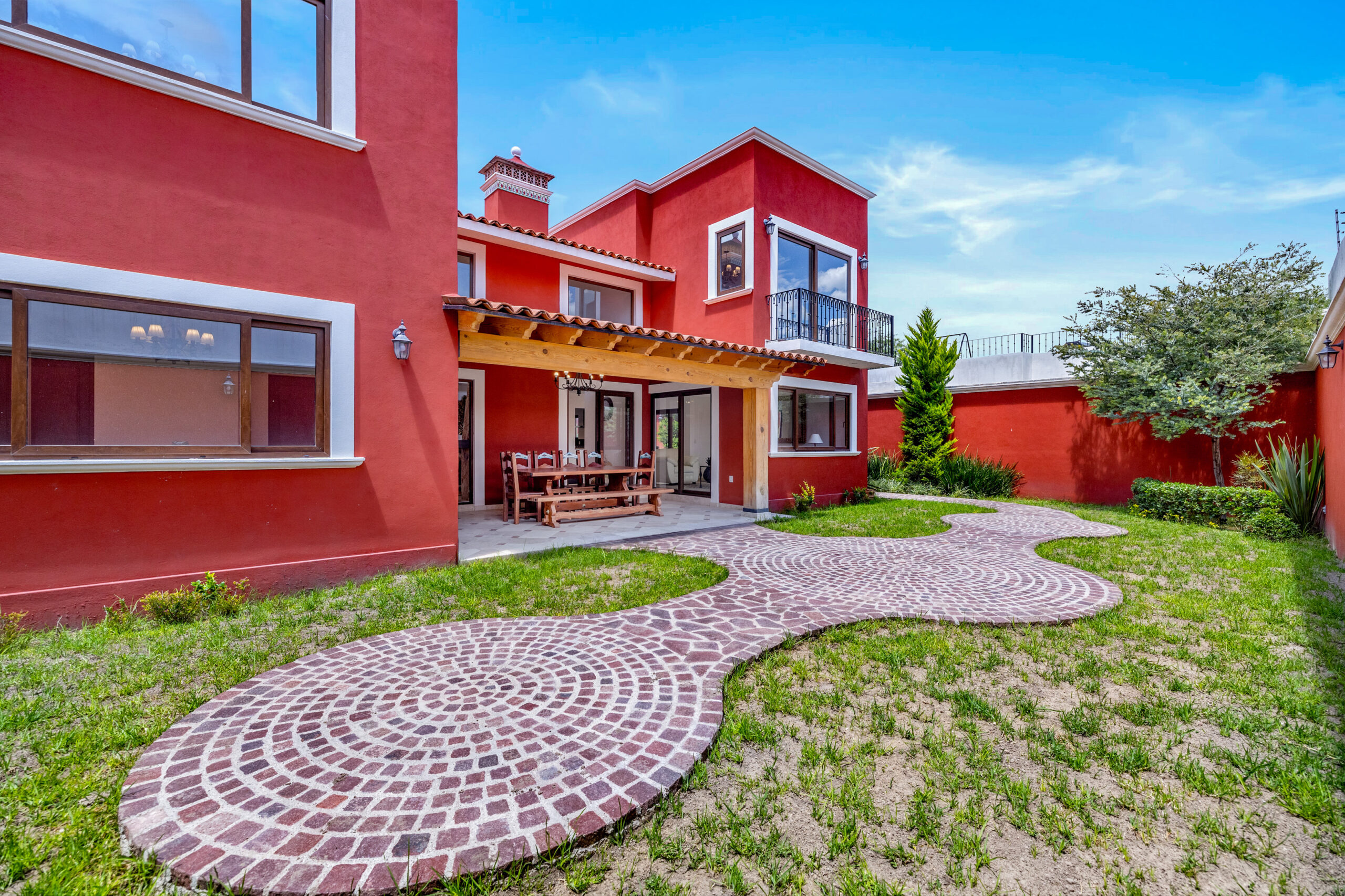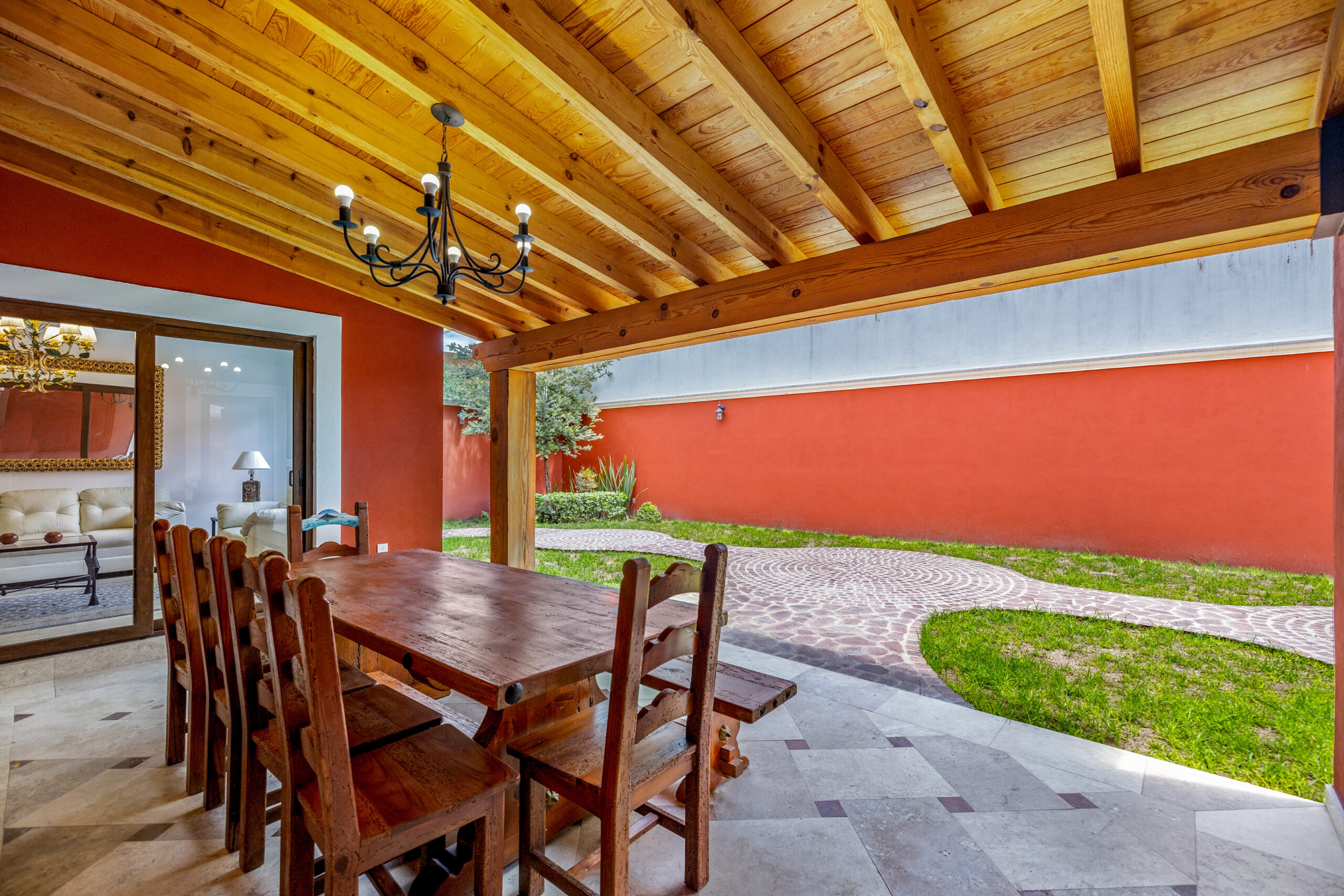 Outdoors, enjoy two distinct garden spaces, one accented by a charming cantera fountain, the other adjoining a covered terrace with elegant wooden beams, ideal for alfresco dining or simply unwinding.