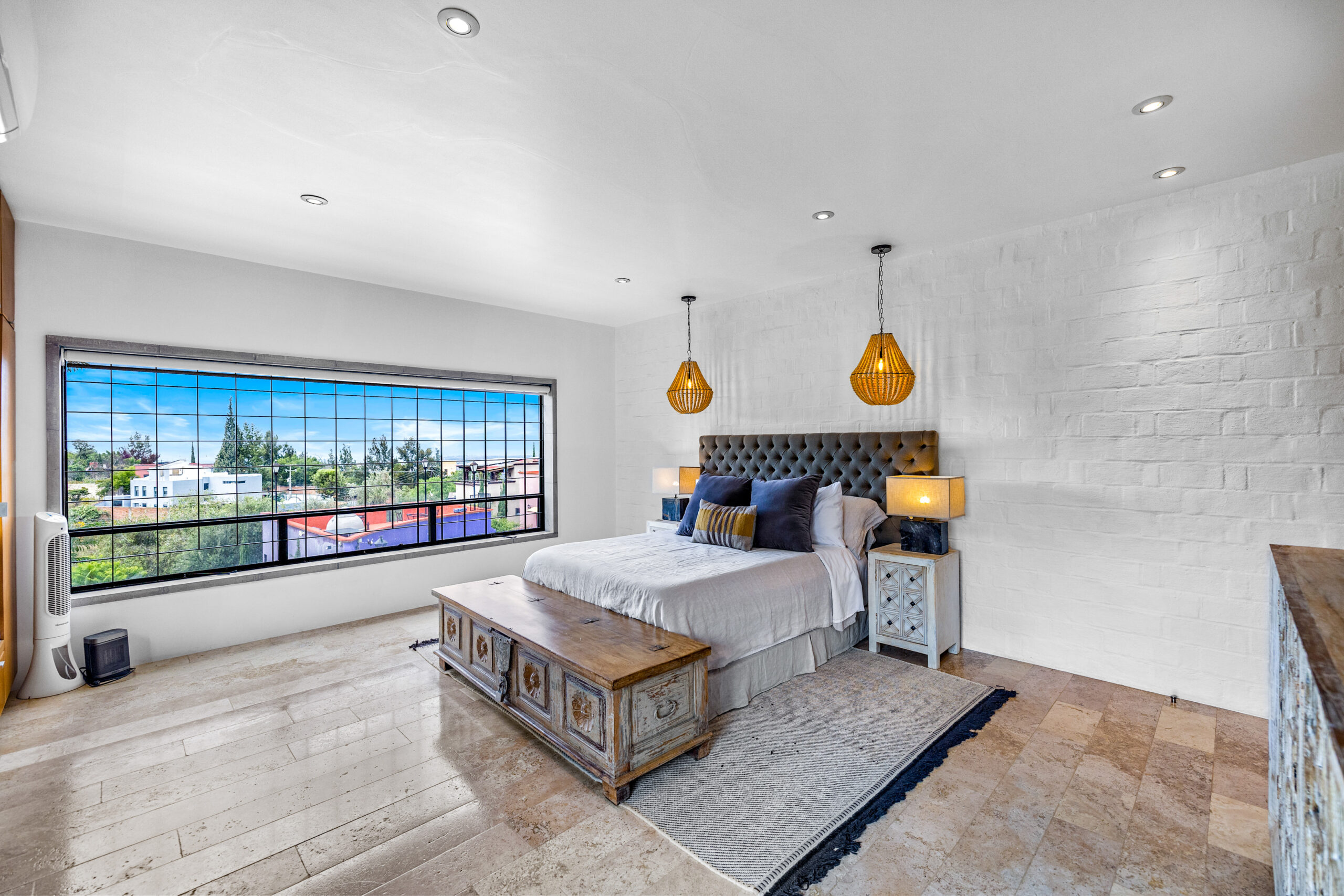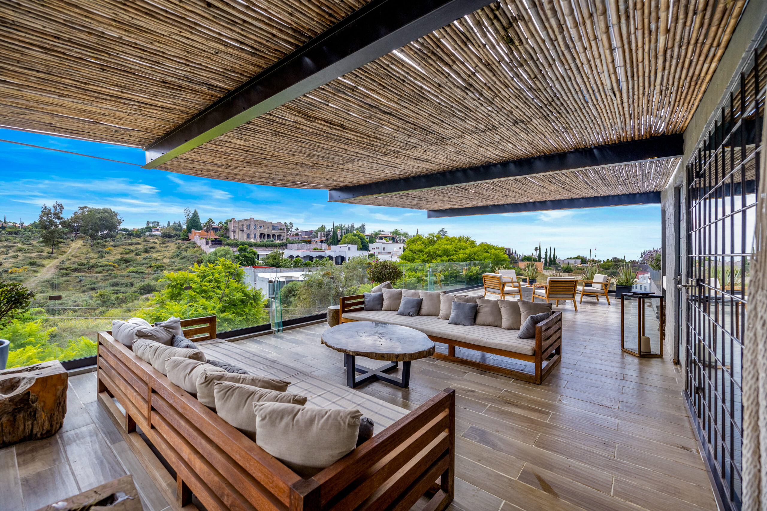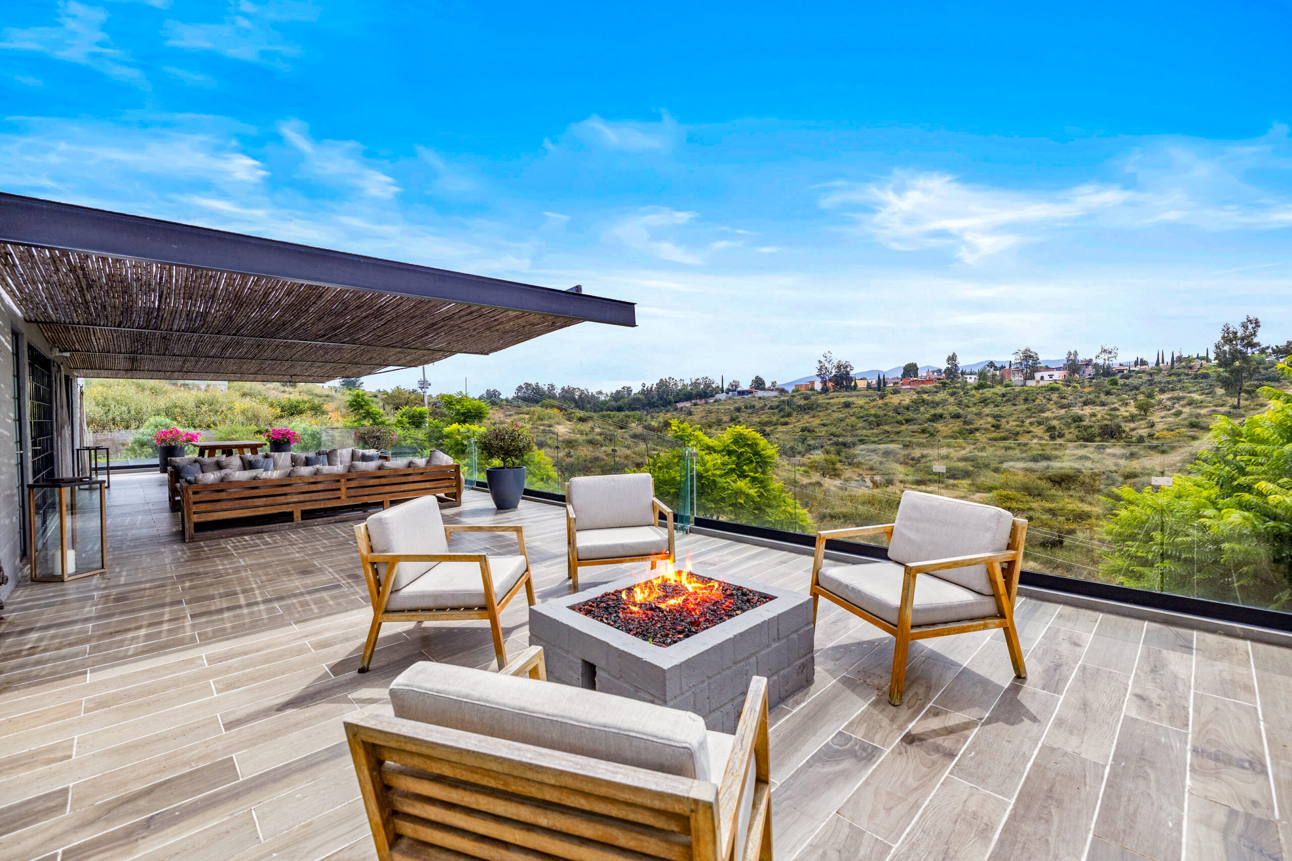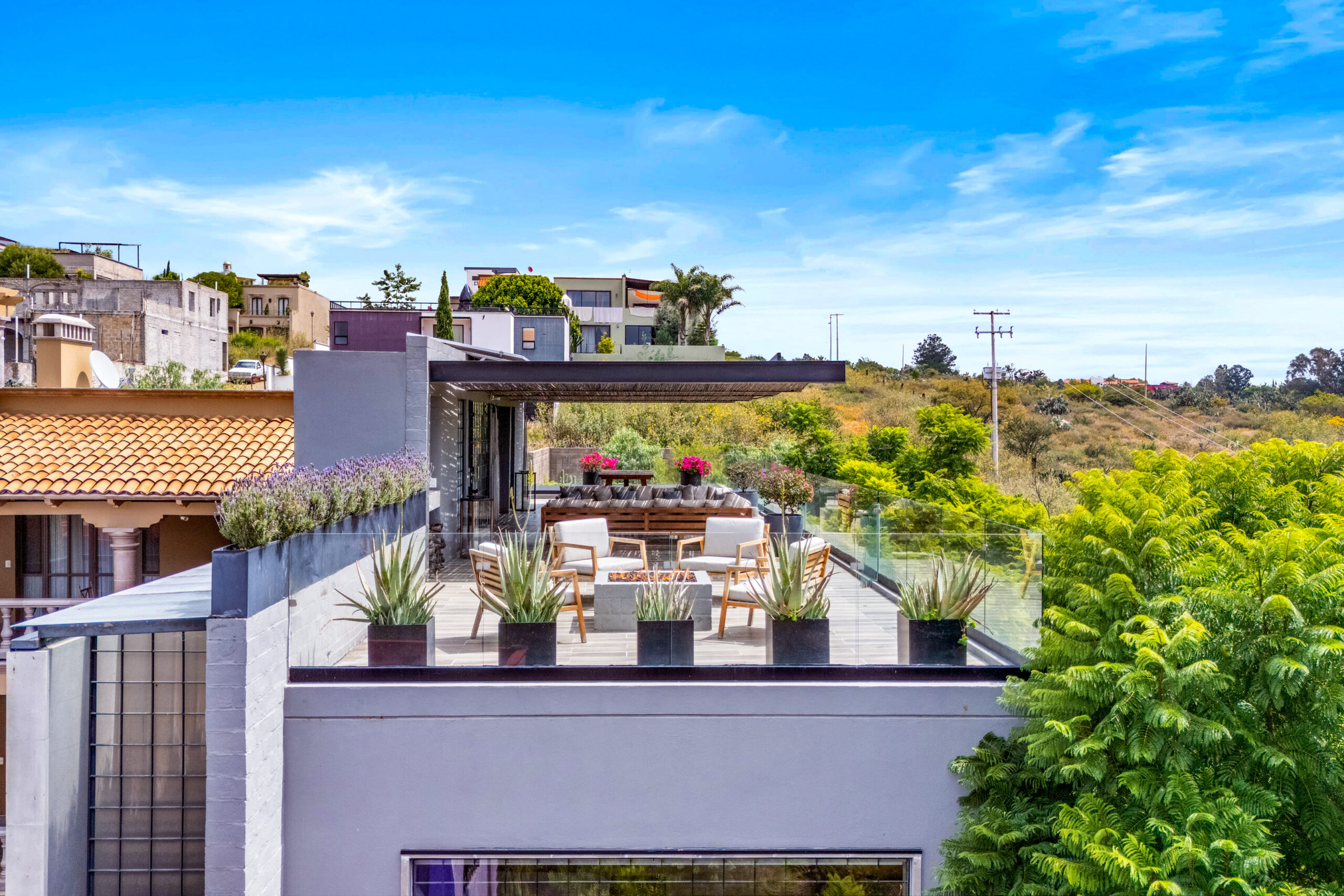 The heart of the home opens through 20-foot glass sliders, connecting the stylish living room to a screened-in patio with an outdoor kitchen, ideal for open-air dining and relaxed evenings with friends. Upstairs, a spectacular rooftop terrace showcases sweeping views of San Miguel, complete with a fire pit, outdoor lounge and dining areas, powder room, and plenty of space for entertaining under the stars.