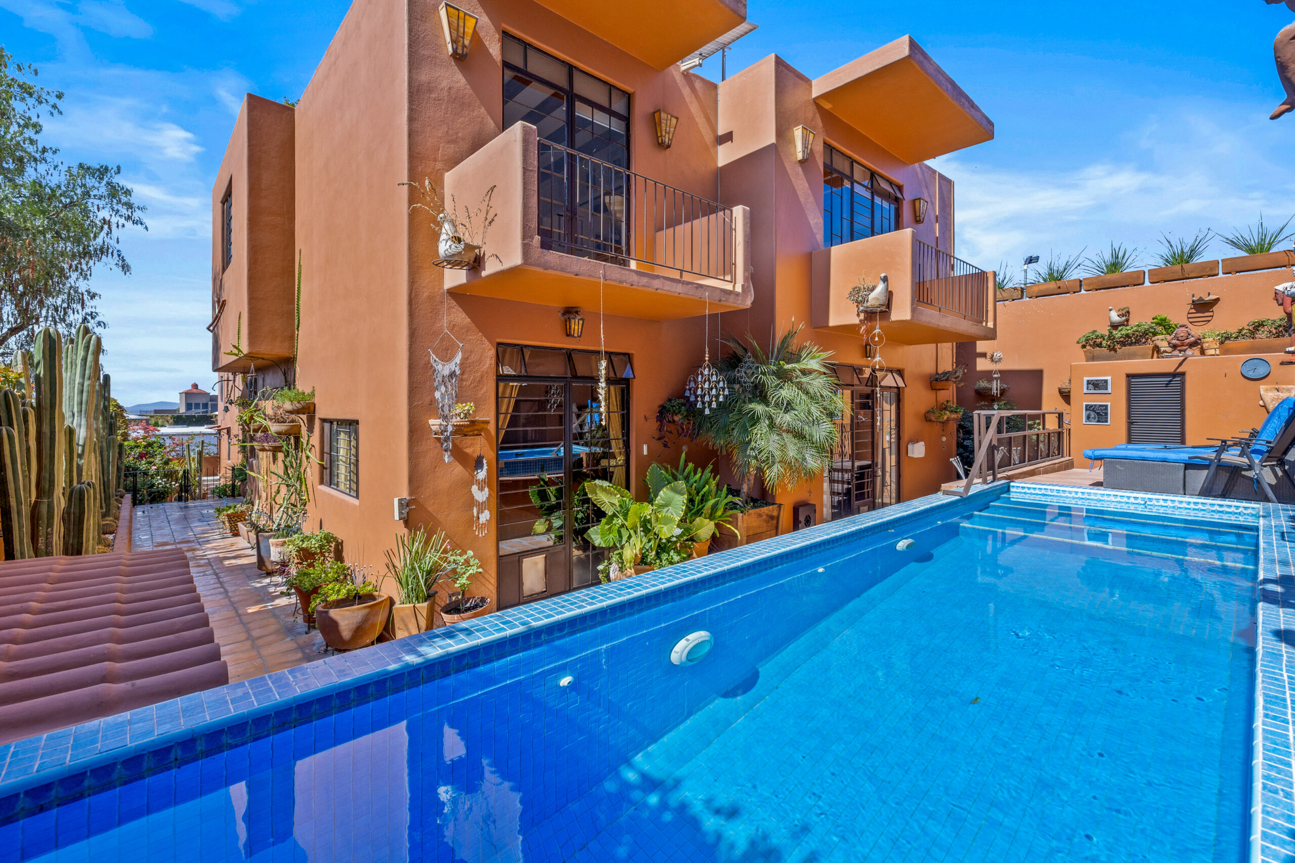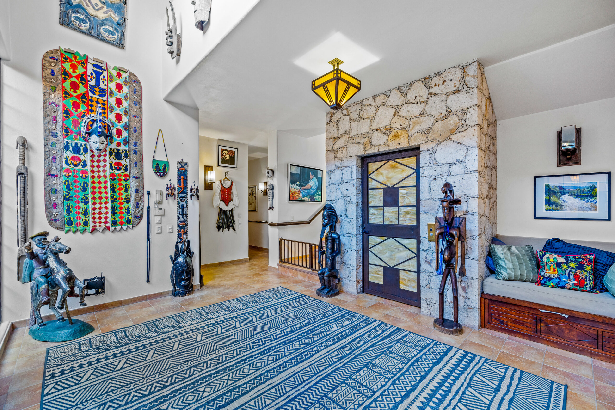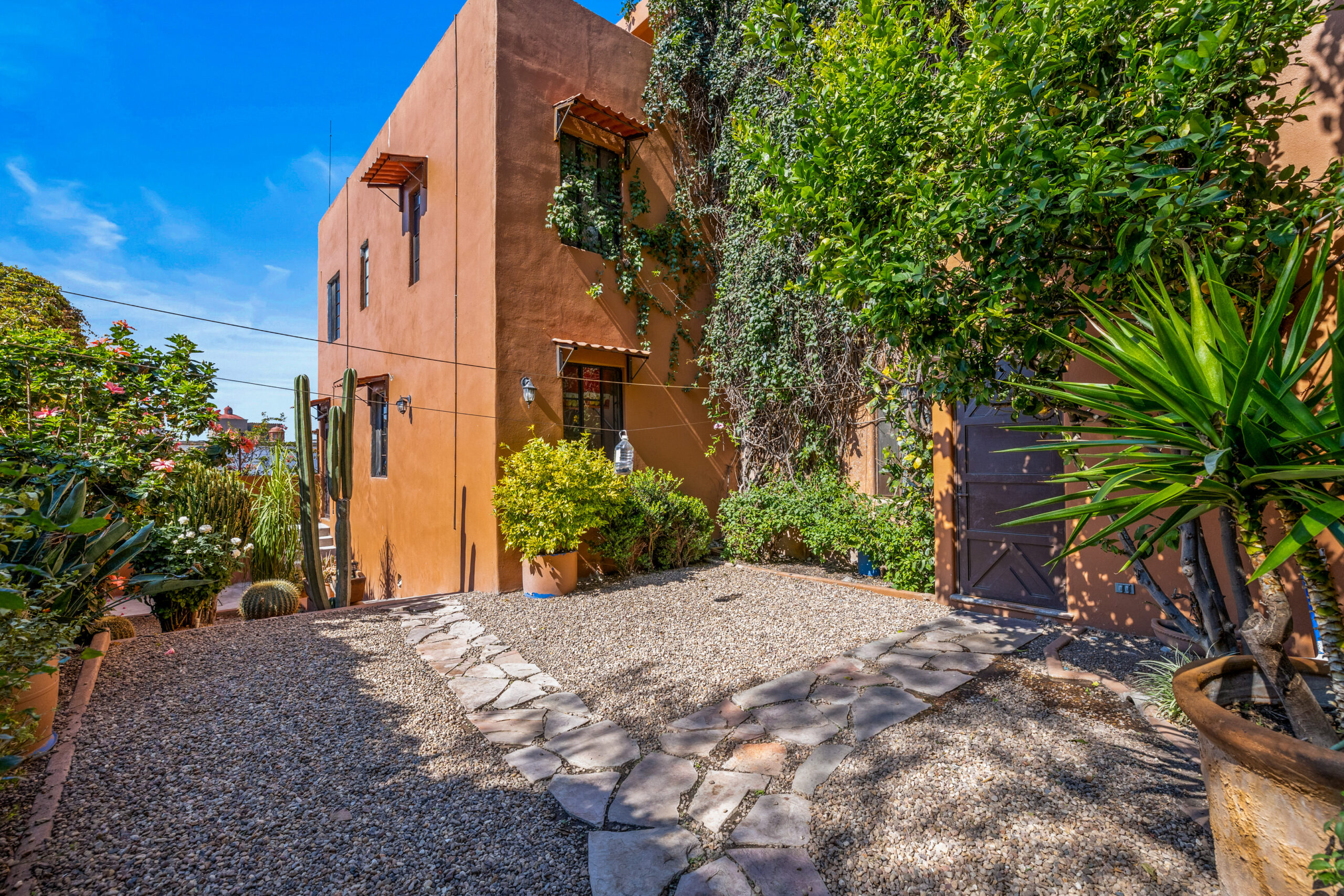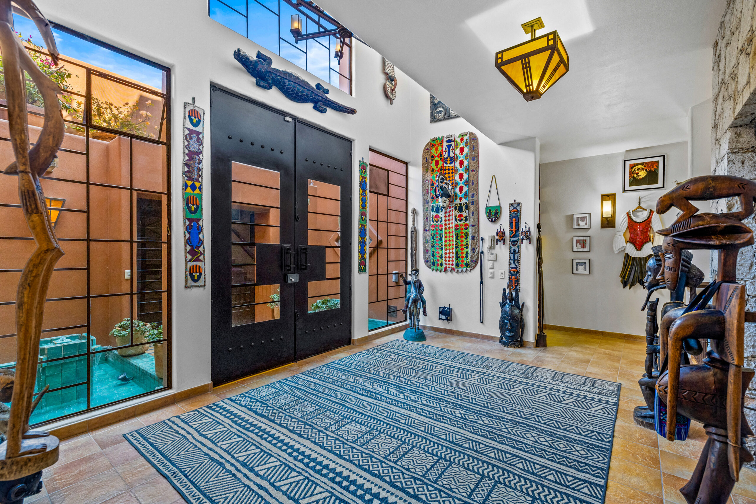 Discover a striking Mexican-modern residence where clean lines, artisanal craftsmanship, and warm design elements come together beautifully. Originally designed and built by the architect as his personal home, it stands as a true homage to his vision and to the artistic spirit of his wife. Positioned directly across from El Charco del Ingenio, this exceptional property offers privacy, nature, and architectural intention in perfect harmony. A dramatic set of double-story metal doors, framed by two artisanal fountains, creates a memorable entrance and sets the tone for the thoughtful design found throughout.
