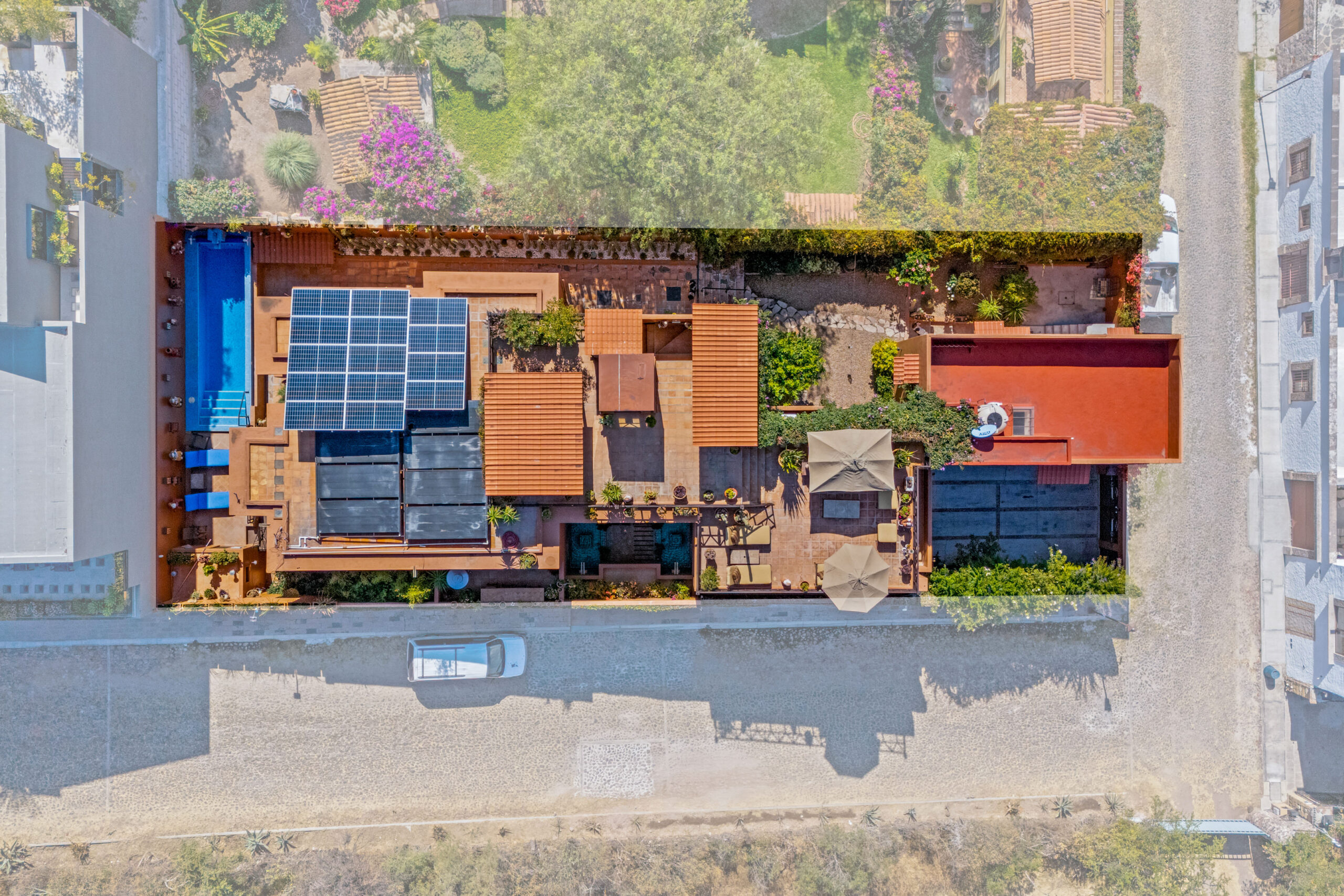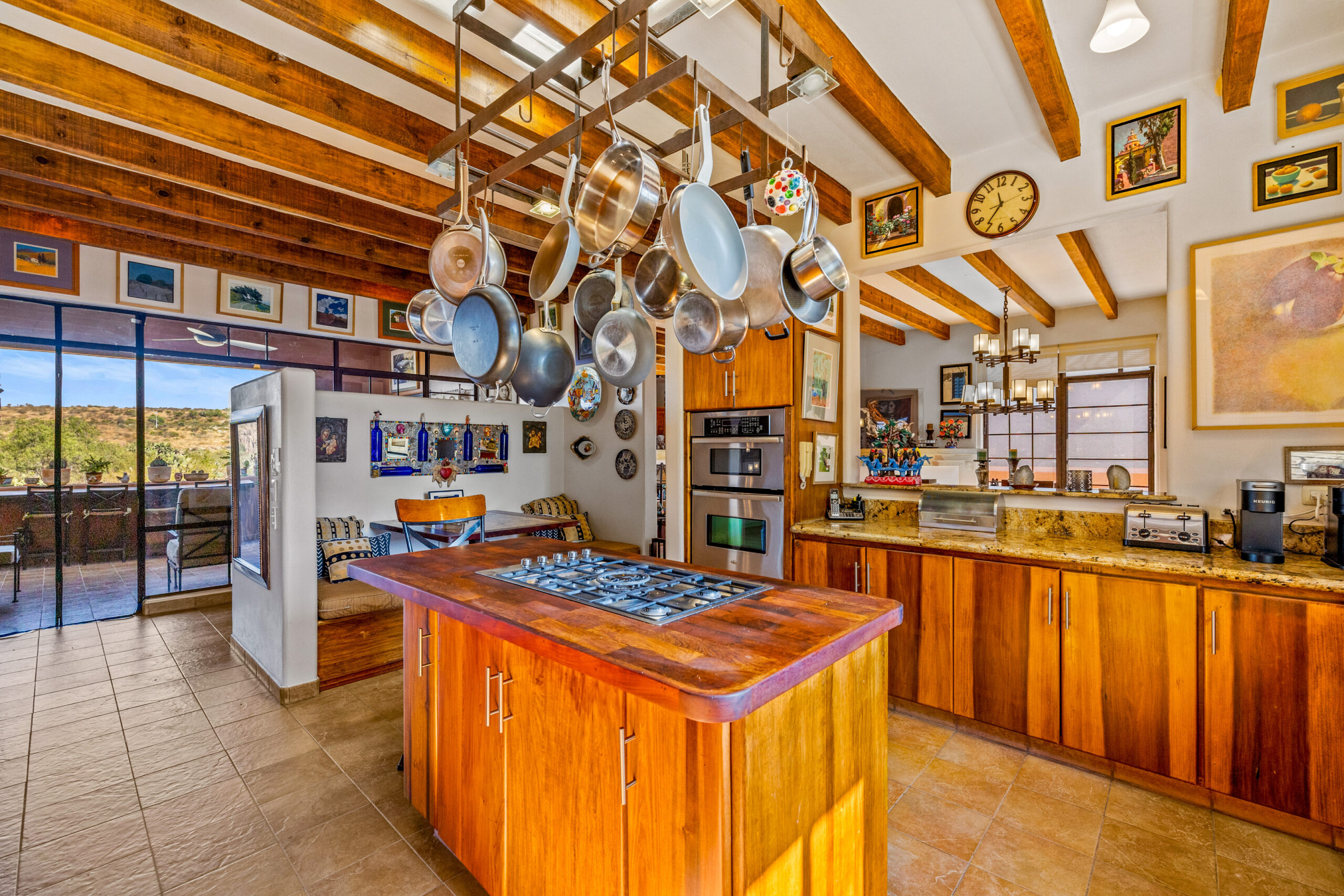 Throughout the house, custom lighting and mesquite furnishings crafted by local artisans create a cohesive and refined environment, complemented by solar electric panels for sustainable, energy-efficient living.