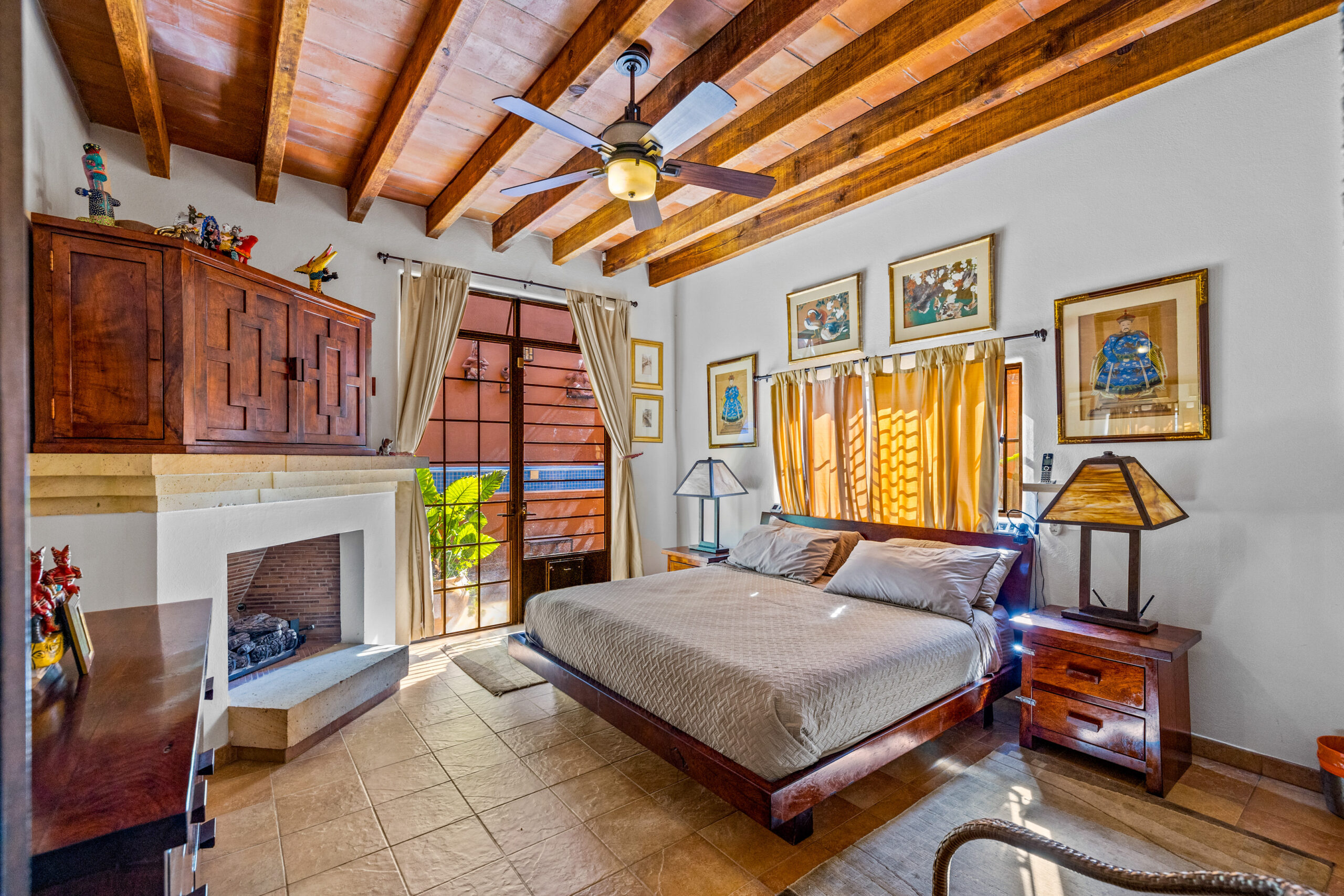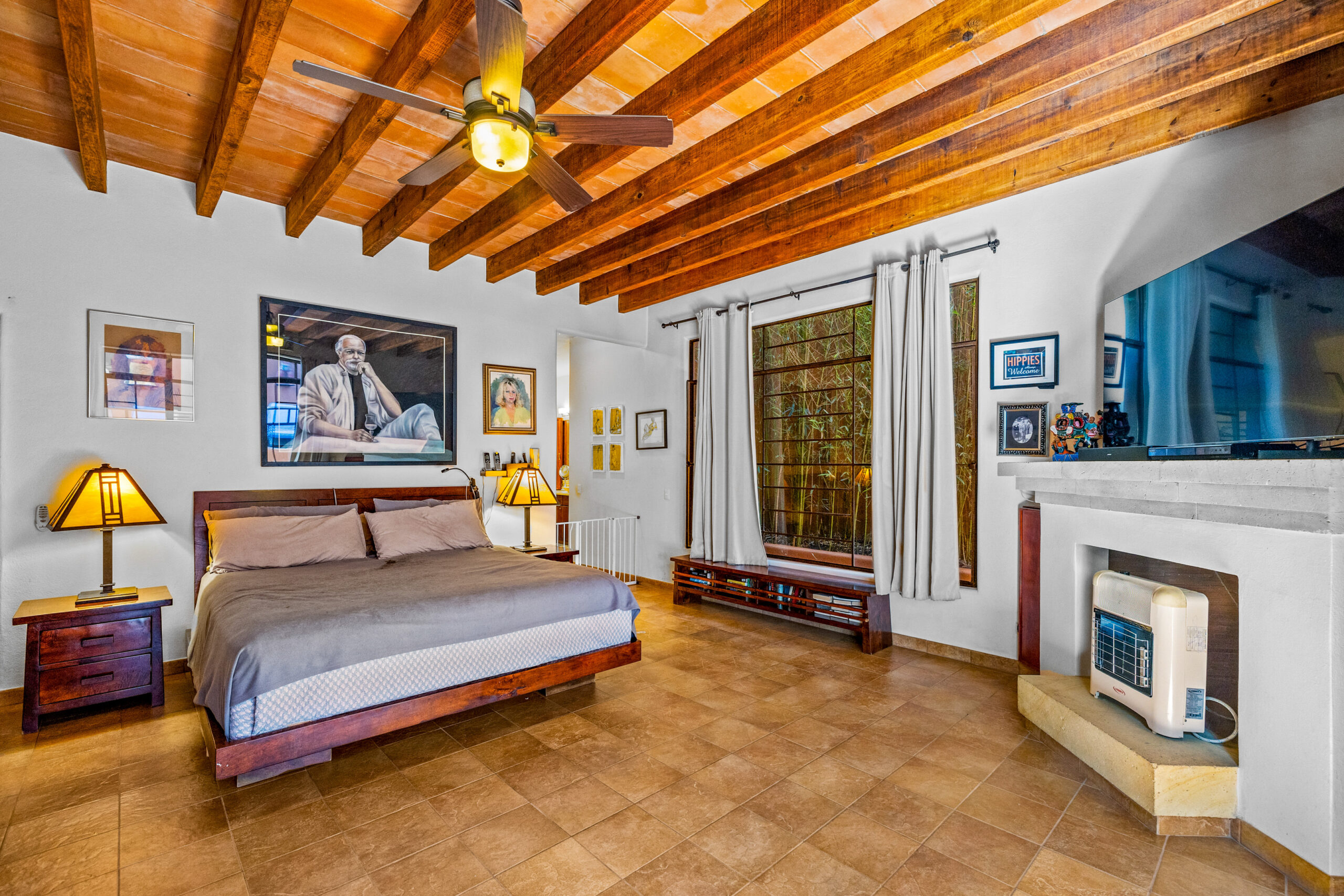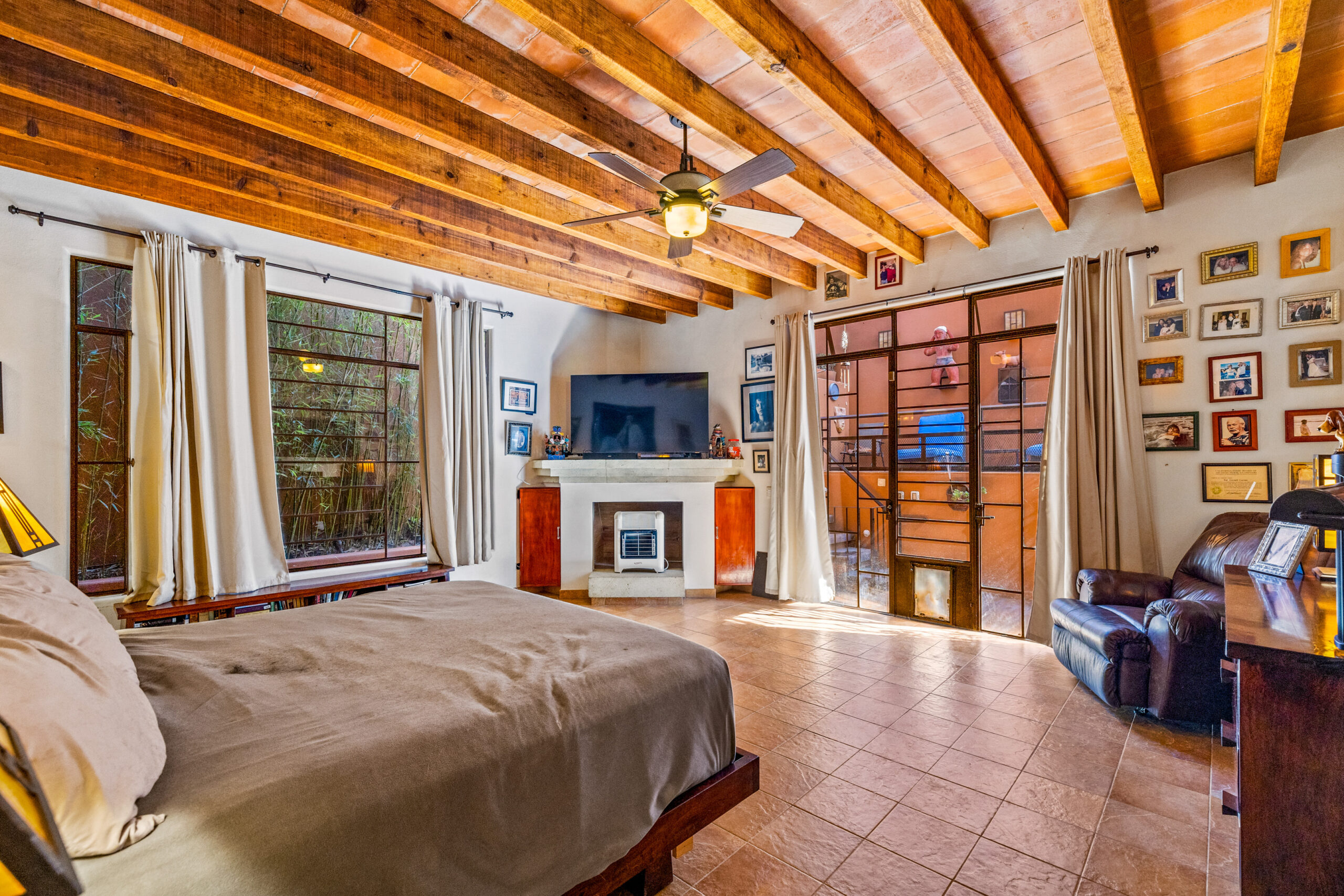 On the first floor, the cool and tranquil private quarters include the primary bedroom and a guest bedroom, offering the comfort of single-level living. A versatile flex room can easily become a third bedroom, office, gym, or media room. The home includes 3 beautifully finished bathrooms with marble or handcrafted artisanal tile, five fireplaces, two spacious walk-in closets, and abundant storage.
