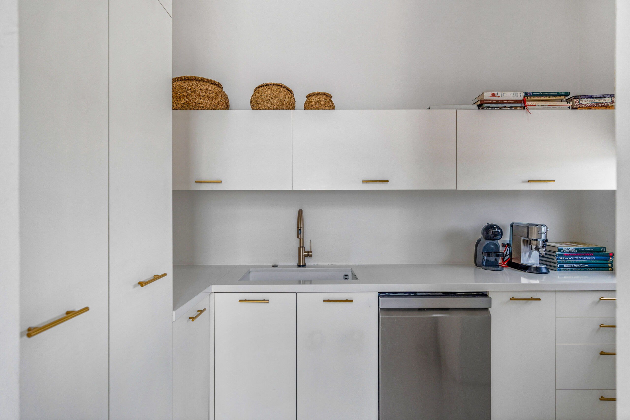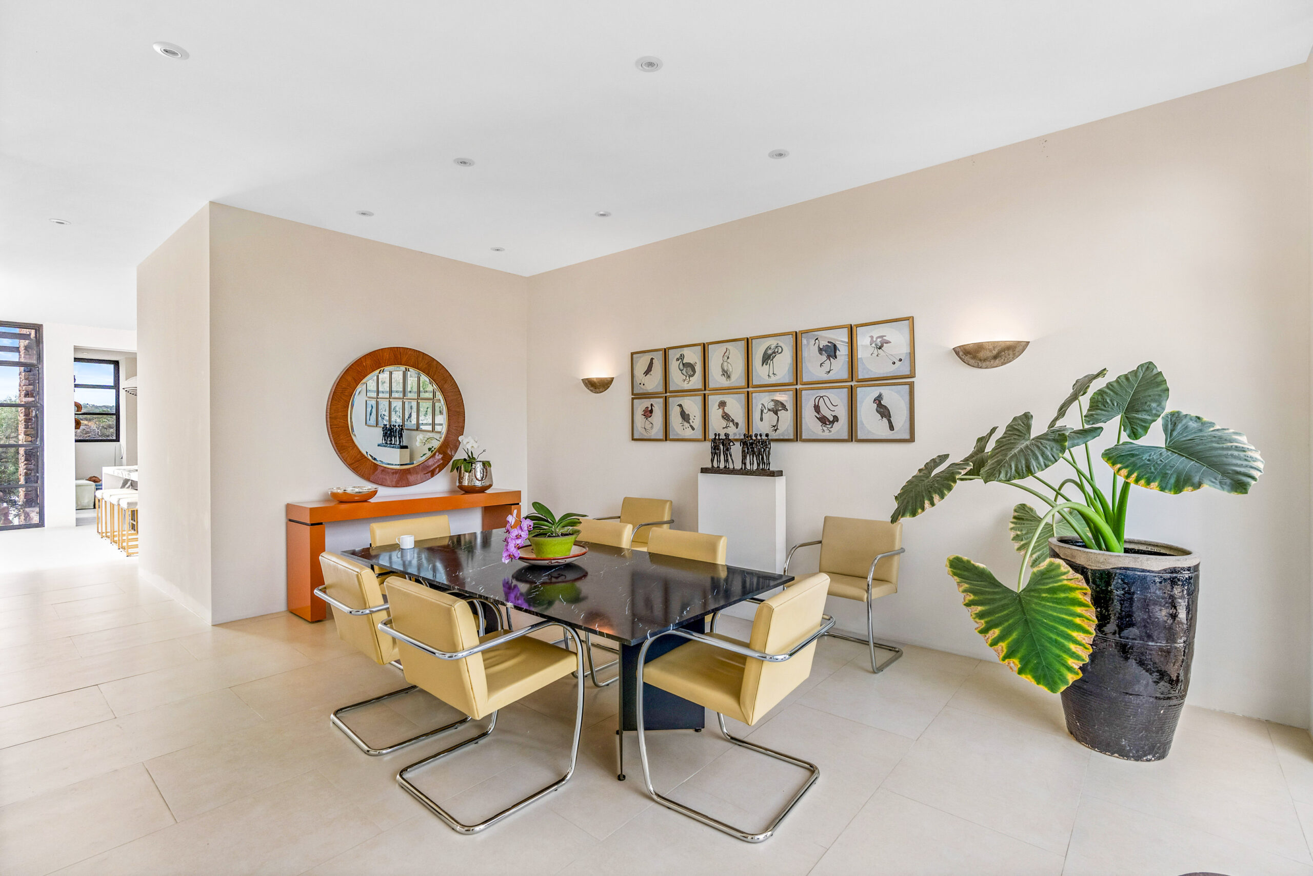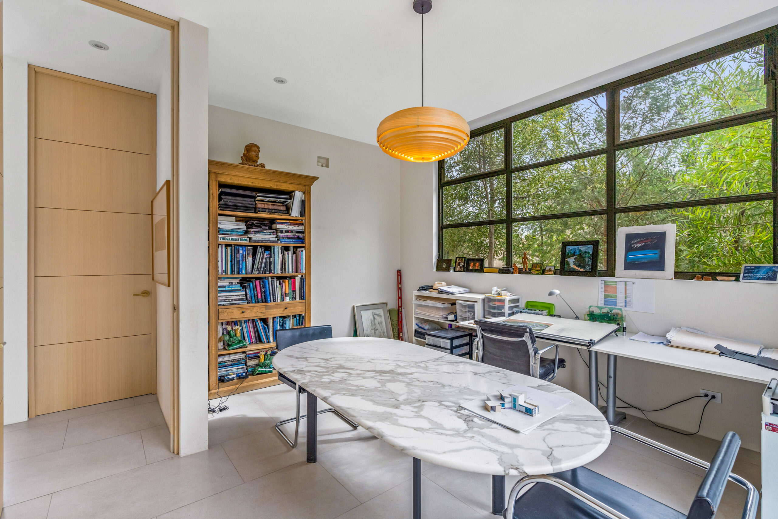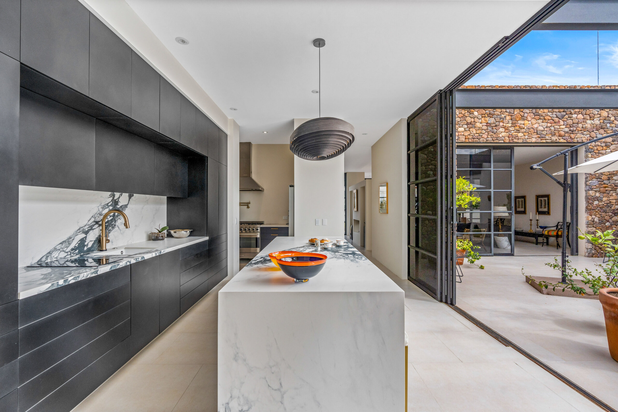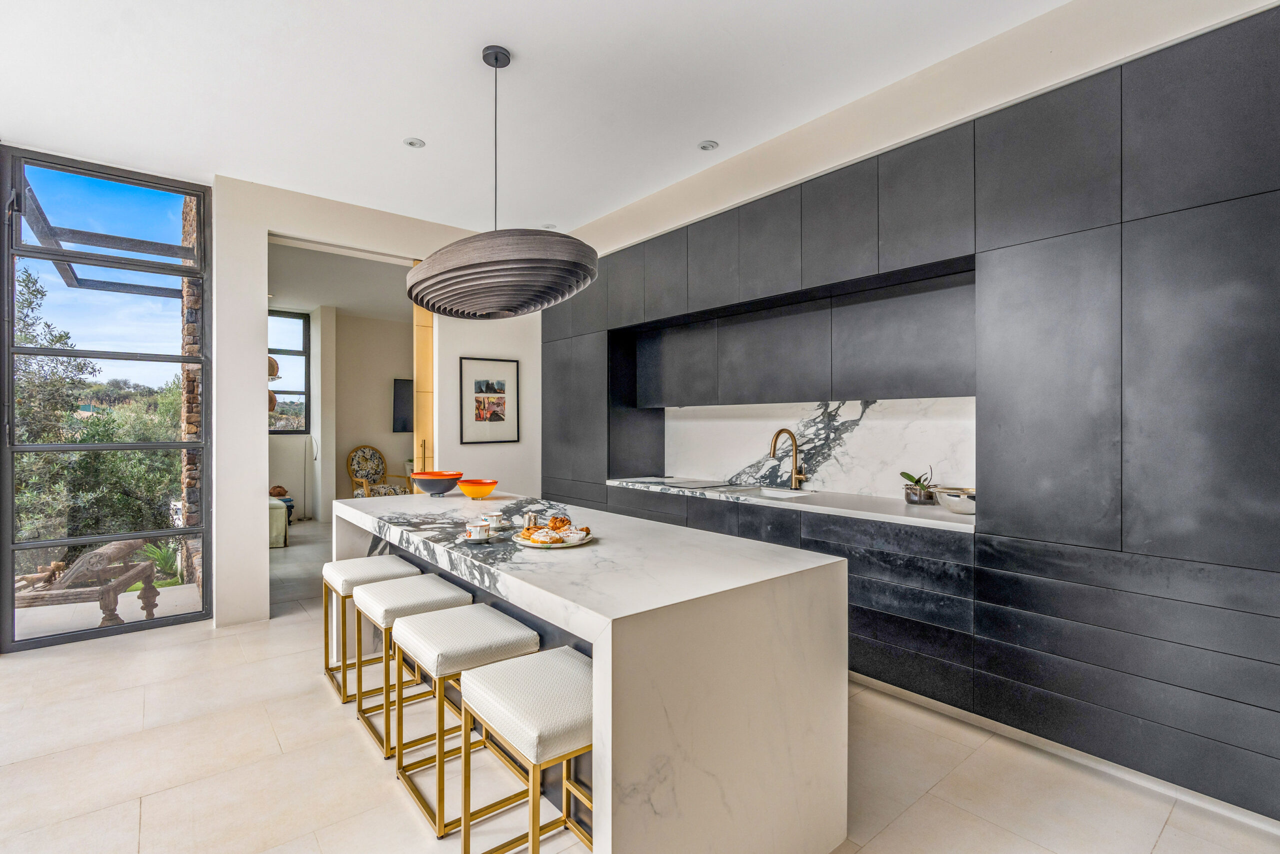 Open-Plan Living & Dining: The home’s social heart features an innovative three-part kitchen, thoughtfully divided into zones for cooking and entertaining. A separate service kitchen, accessible through a second entry, is ideal for caterers or for conveniently unloading groceries. Countertops are crafted from Antolini Tech, adding both elegance and durability.